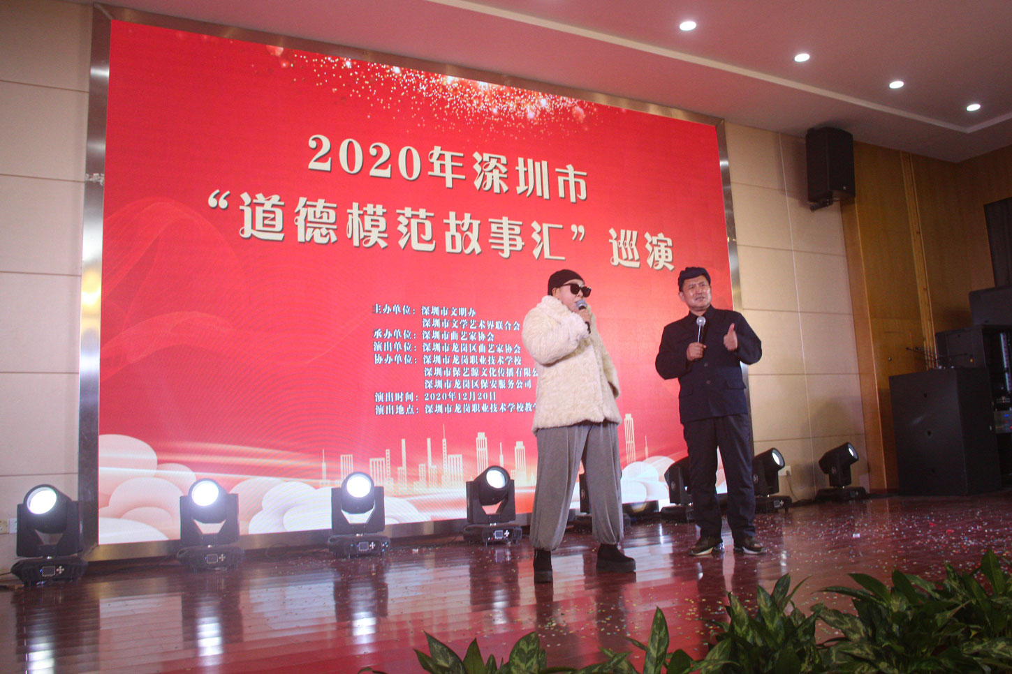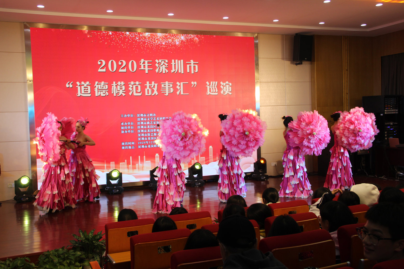 12月20日 2020年深圳市“道德模范故事匯”巡演在深圳市龍崗職業(yè)技術(shù)學(xué)校教學(xué)樓匯報(bào)廳舉行。本次巡演由 深圳市文明辦 深圳市文學(xué)藝術(shù)界聯(lián)合會(huì)主辦 深圳市龍崗職業(yè)技術(shù)學(xué)校,深圳市保藝源文化傳播有限公司,深圳市龍崗區(qū)保安服務(wù)公司等單位協(xié)辦 當(dāng)晚,演出節(jié)目囊括了 舞蹈:《不忘初心》,女聲獨(dú)唱:《春天的腳步》,滑稽魔術(shù):《道德模范標(biāo)語(yǔ)秀》,小 品:《心中的道德模范》,特型表演:《鄧小平形象扮演》等多樣化的表演形式,詮釋全國(guó)道德模范熱愛(ài)祖國(guó)、為民奉獻(xiàn)的家國(guó)情懷,自強(qiáng)不息、砥礪前行的奮斗精神,積極進(jìn)取、崇德向善的高尚情操。